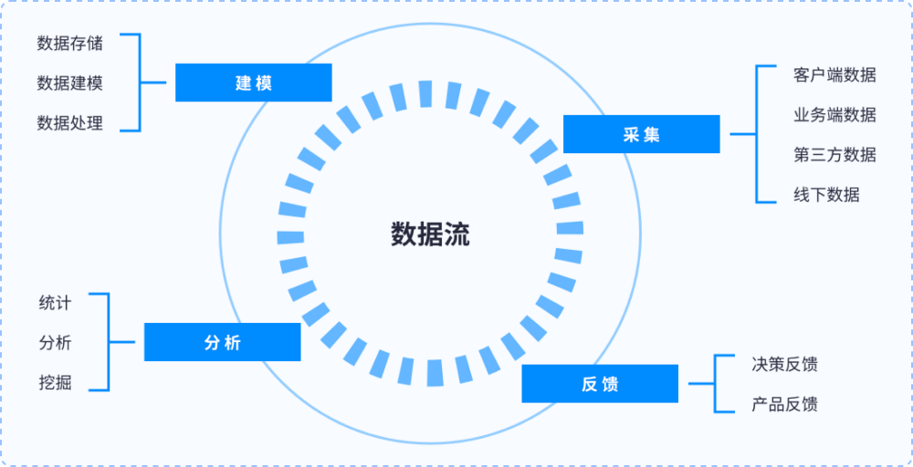 通过移动互联网或者其他的相关软件为手段采集海量的数据,将数据进行组织形成信息,之后对相关的信息进行整合和提炼,在数据的基础上经过训练和拟合形成自动化的决策模型。简单来说,就是以数据为中心依据进行决策和行动。基于完整的数据驱动闭环方案对业务进行赋能:数据采集-->数据建模-->数据分析-->数据反馈。